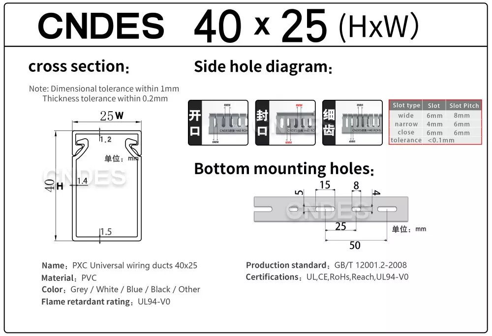 Tá an Ducht Suiteála Sreangaithe PVC Saincheaptha 40 × 25 ó CNDES deartha le haghaidh painéil leictreacha dlúth, caibinéid rialaithe beaga, agus imfháluithe tionsclaíocha. Ligeann a phróifíl caol 40 × 25 mm go n-eagrófar cábla néata i spásanna daingean, ag coinneáil línte cumhachta, comharthaí agus sonraí scartha go glan agus inrochtaineacht agus sábháilteacht a fheabhsú.