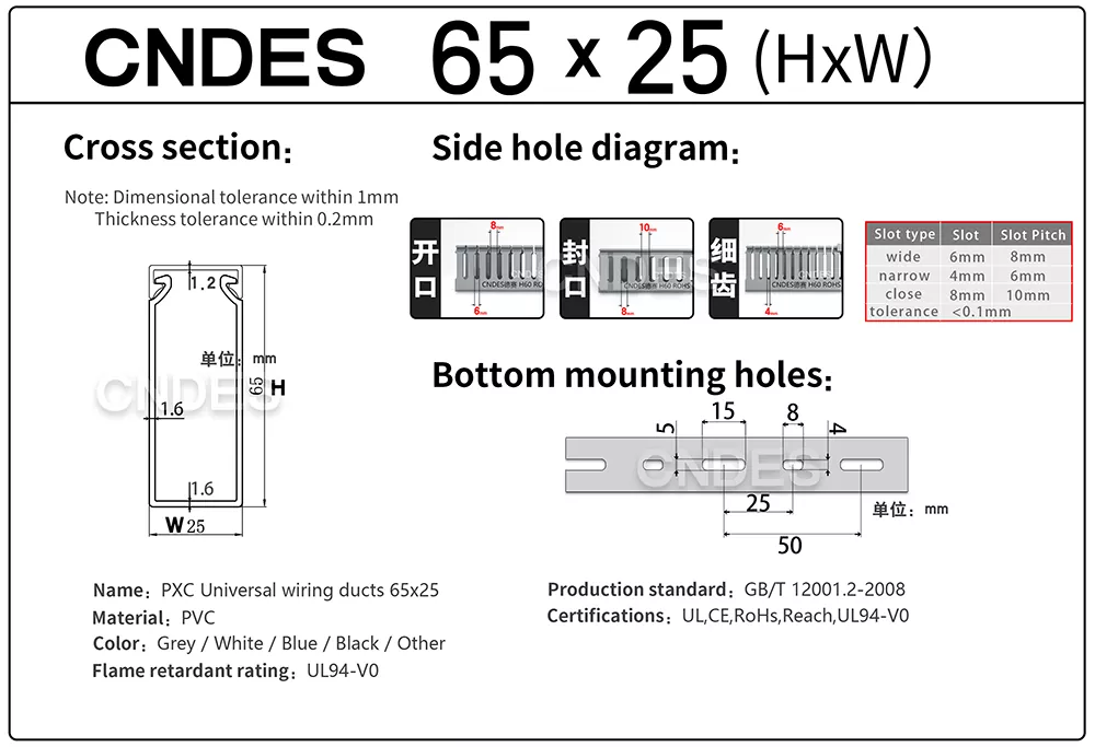Is cainéal bainistíochta cábla caol-phróifíl é CNDES' Customized 65×25 Cábla Tray Ducts déanta as PVC docht. Úsáidtear go príomha é chun cáblaí a threorú agus a chosaint i réimsí ina bhfuil: